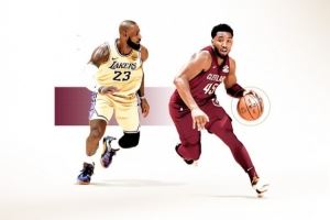 骑士官推晒出由湖人球员詹姆斯和骑士球员米切尔组成的海报,并附上了本场比赛的购票链接。