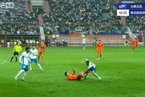 比赛第43分钟,宋浩宇防守时被倒地的罗竞踢到裆部,随后队医进场治疗。